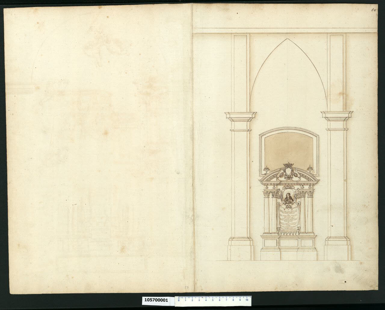 - NOTIZIE STORICO CRITICHE Nell'"Indice" del tomo nel quale era rilegato il disegno viene definito: "Altro Deposito".\nIl disegno raffigura il monumento funebre di Teodora Krystyna Tarnowska, realizzato nel 1652 nella chiesa di S. Michele a Wilno su progetto di Giovanni Battista Gisleni. Il disegno austero e classicheggiante ha come modello l'altare di S. Francesco Saverio nella chiesa del Gesù a Roma costruito tra il 1672 e il 1676 da Luca Berrettini su disegno del Bernini (Karpowicz 1999). L'altare è posto sotto una finestra ed è composto da una coppia di colonne corinzie su alti basamenti, che reggono i due segmenti semicircolari del timpano interrotto dalla presenza di uno scudo araldico. Tra le colonne è ubicato il cartiglio con il ritratto della defunta, al quale è appeso un drappo recante un'iscrizione.