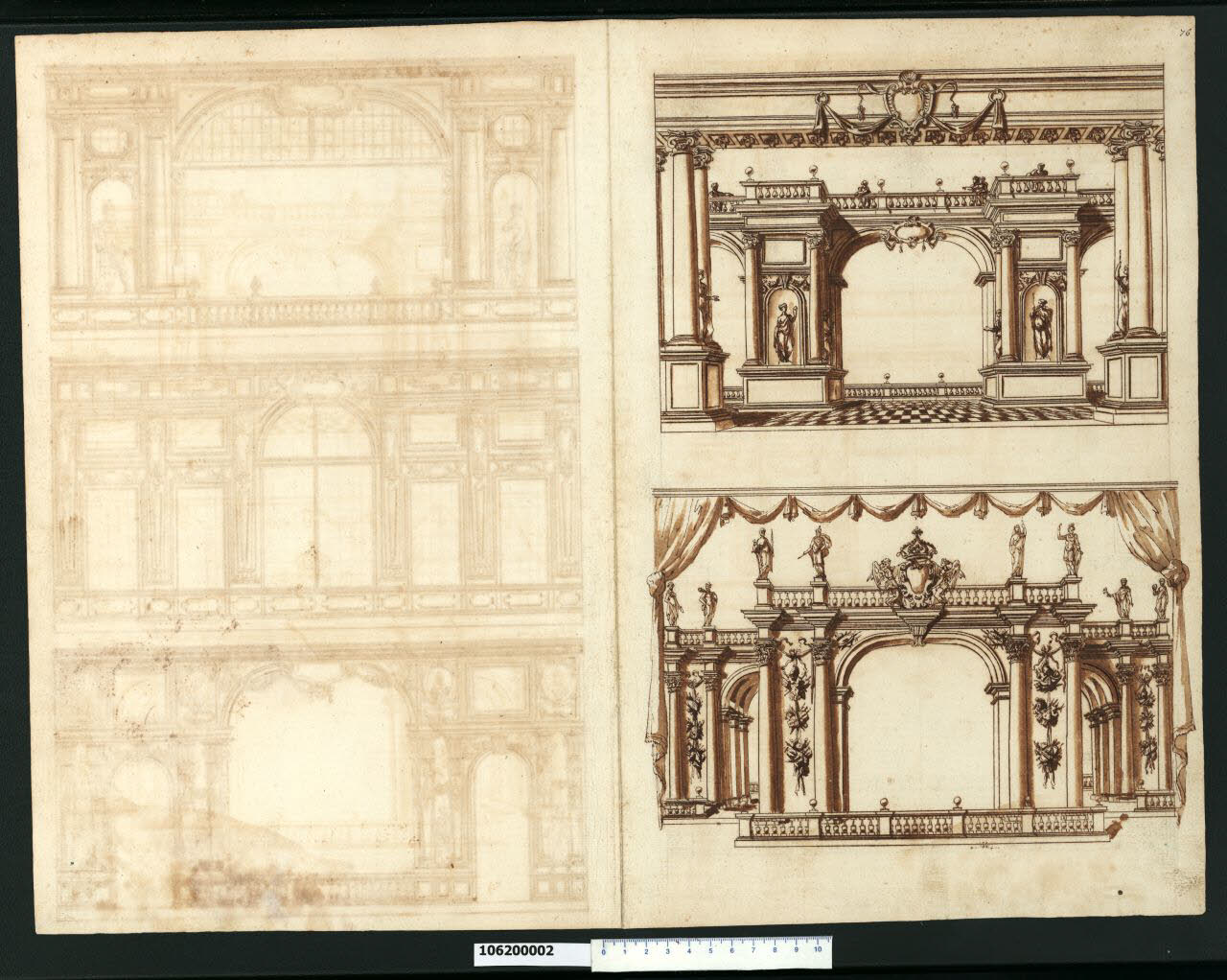- NOTIZIE STORICO CRITICHE Nell'"Indice" del tomo nel quale era rilegato il disegno viene definito: "Altro come sopra" (leggi: "Addobbo per illuminazione").\nIl presente foglio, così come quello in Milano, Collezione Sardini Martinelli inv. 1,61 r-v, raffigura due esempi di decorazioni parietali che non è stato possibile identificare. Mossakowski nel suo articolo (1995, rieditato nel 2002) dedicato alla galleria della villa suburbana della regina Maria Lodovica Gonzaga Nevers a Varsavia (Milano, Collezione Sardini Martinelli inv. 1,64), inserisce nell'apparato iconografico anche il disegno inv. 1,61r e lo identifica come un progetto di decorazione per un'alcova. A differenza dei disegni tracciati sul recto del foglio e quelli dell'inv. 1,61, questi mostrano la parete con una decorazione a imitazione di un loggiato aperto sul paesaggio, con archi in prospettiva e nicchie ornate da statue nella soluzione in alto; con trofei militari negli intercolumni e grande stemma regale, nella soluzione in basso. La presenza di questo stemma suggerisce che forse l'alcova si trovava nella villa sopra citata.