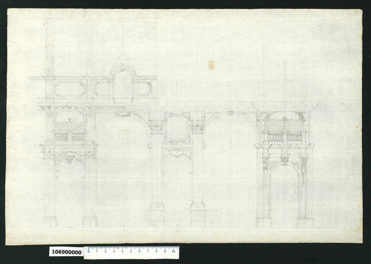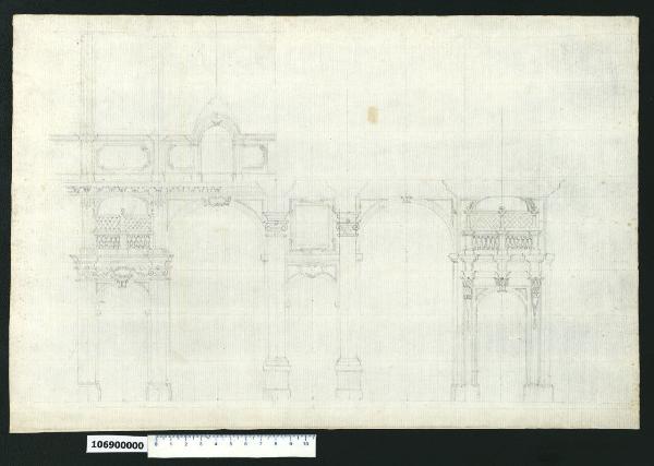 - NOTIZIE STORICO CRITICHE Nell'"Indice" del tomo nel quale era rilegato il disegno viene definito: "Altra come sopra" (leggi: "Spaccato di Chiesa").\nIl disegno che non è stato possibile identificare, mostra due diverse soluzioni per l'articolazione parietale della navata coperta da volta a botte con costoloni appena accennati nella parte sinistra del disegno. La parete è divisa in campate di diversa ampiezza, le più grandi sono ad arco a tutto sesto con ghiera tangente all'architrave della trabeazione. Le campate più piccole si differenziano l'una dall'altra: in quella di sinistra due paraste ribattute di ordine ionico inquadrano un'apertura ad arco con mensola in chiave di volta, sopra la quale si sviluppano un coretto dotato di balaustra e gelosia; nella campata a destra mentre si ripete la medesima sequenza verticale, variano gli elementi decorativi inserendo delle mensole scanalate in luogo dei capitelli delle lesene; infine, la campata centrale è delimitata da due lesene ioniche di ordine gigante che giungono fino alla trabeazione, tra quest'ultima e la ghiera dell'apertura ad arco è inserito un pannello rettangolare. Il disegno è stato pubblicato da Mossakowski (1997 p. 99, fig. 11) che ritiene possa essere uno studio di G.B. Gisleni per l'interno di una chiesa.