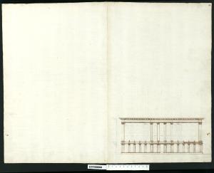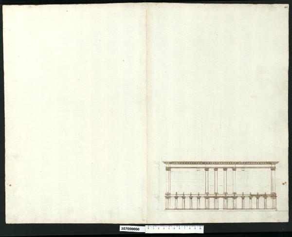 - NOTIZIE STORICO CRITICHE Nell'"Indice" del tomo nel quale era rilegato il disegno viene definito: "Schizzo di Palazzo".\nIl disegno che non è stato possibile identificare raffigura il prospetto di un palazzo articolato su due ordini sovrapposti. L'ordine inferiore è suddiviso in tredici campate da lesene ribattute, con la parte frontale rastremata verso il basso; in corrispondenza degli angoli e della tre campate centrali le lesene sono più ampie per l'aggiunta di un'ulteriore ribattitura. La trabeazione di questo primo ordine funge da parapetto/balaustra di un balcone (come mostra la sezione tracciata a matita a sinistra del prospetto) che dovrebbe svilupparti per tutta la lunghezza del fronte. I due piani superiori dell'edificio sono caratterizzati da sei lesene ioniche di ordine gigante nella zona centrale (quattro ripassate a china e due lasciate a matita) e agli angoli dove sono previste ribattute. La trabeazione superiore presenta una cornice retta da mensoline e, in corrispondenza delle quattro lesene giganti è tracciato a matita un timpano triangolare.