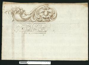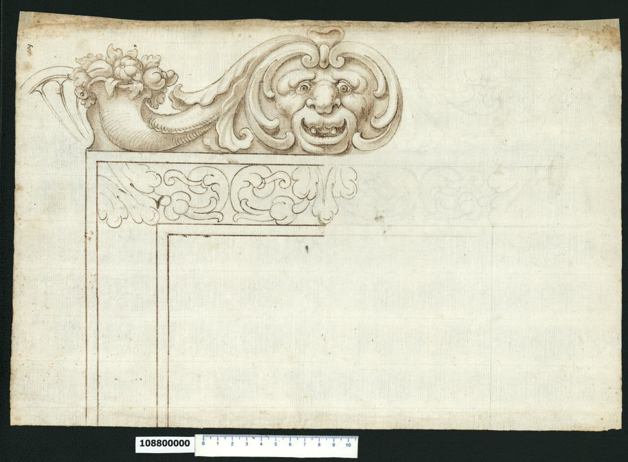 - NOTIZIE STORICO CRITICHE Nell'"Indice" del tomo nel quale era rilegato il disegno viene definito: "Ornato". \nSi tratta del disegno solo parzialmente definito di una cornice ornata con un motivo a tralci di vite fioriti e decorata nella parte superiore da un mascherone dai tratti leonini, incorniciato da tralci ricurvi che partono da due volute alla sommità della fronte e da cui ha origine anche un calice (o cornucopia) ricolmo di frutti e fronde. Sullo spigolo della cornice è parzialmente tratteggiato un decoro a forma di conchiglia. Le parti ornamentali definite sono tratteggiate con cura e i soggetti rappresentati fanno parte del repertorio decorativo del XVII secolo.