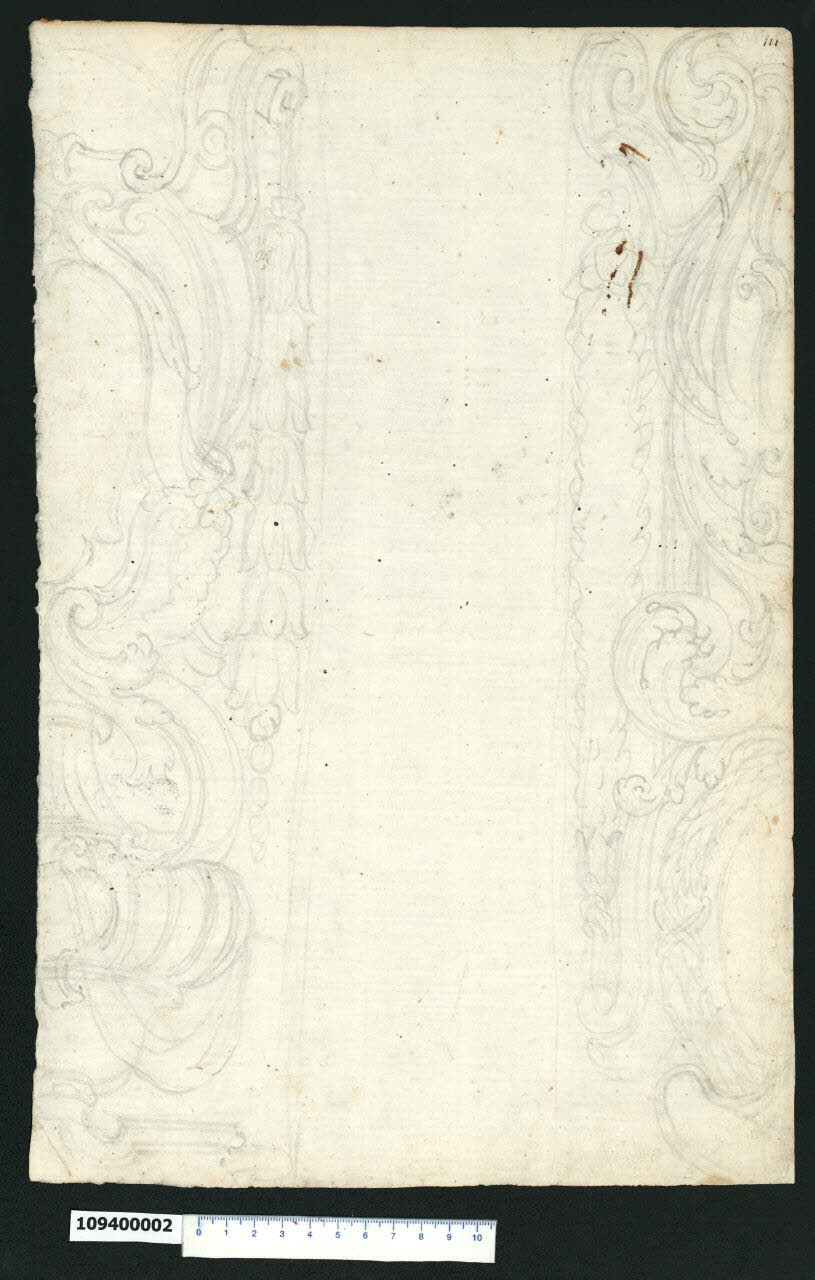 - NOTIZIE STORICO CRITICHE Nell'"Indice" del tomo nel quale era rilegato il disegno viene definito: "Ornati diversi".\nIl disegno raffigura probabilmente progetti decorativi per cartelle in stucco con girali di foglie d'acanto, ghirlande, nastri e volute.