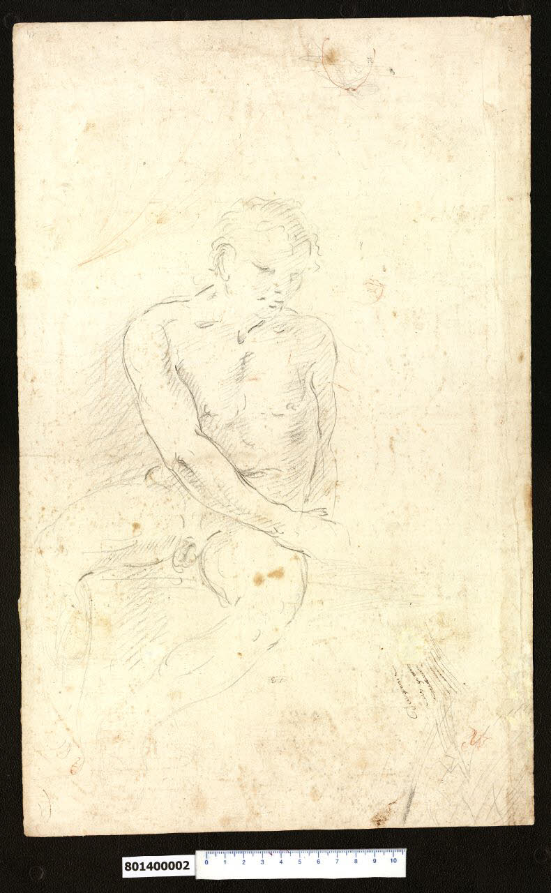 - NOTIZIE STORICO CRITICHE Il disegno, non ricordato nell'indice del volume nel quale il marchese Giacomo Sardini lo aveva rilegato, raffigura un nudo virile seduto, le gambe divaricate leggermente rivolte verso destra e il busto ruotato nella direzione opposta quasi che la mano destra, appena abbozzata, volesse protendersi ad afferrare un oggetto, non compreso però nella rappresentazione. Le ombreggiature suggerite con una certa approssimazione mediante il tratteggio della matita, lo scorcio impreciso delle gambe, il segno grafico alquanto esitante costituiscono altrettanti segnali di una mano non troppo esperta, che potremmo identificare con quella dello stesso marchese Sardini. Dal ricco materiale documentario a lui riconducibile nel fondo di famiglia conservato presso l'Archivio di Stato di Lucca, risulta che non solo le sue riflessioni teoriche sull'architettura erano accompagnate da schizzi - e suoi disegni architettonici relativi al palazzo cittadino in via Cesare Battisti e alla villa di Pieve Santo Stefano sono presenti anche nella stessa Collezione Sardini Martinelli - ma che egli si applicava anche allo studio della figura umana (Lucca, Archivio di Stato, Sardini 103, Studi di Disegno del Marchese Giacomo Sardini), com'è da aspettarsi da un appassionato d'arte che, seppure da dilettante, aveva avuto come "antico maestro" il lucchese "Pittor Benigni", il Giovan Battista già allievo di Pompeo Batoni (appunto manoscritto del Sardini sulla lettera scritta da Firenze il 22 giugno 1793 da Domenico Moreni: Lucca, Archivio di Stato, Sardini 142, lettera 484). Nel foglio in esame la bocca e il mento, delineati con tratto incisivo a matita rossa sulla destra del volto virile, trovano una puntuale corrispondenza nelle figure disegnate, verosimilmente dal Sardini, nel volumetto sopra citato dell'Archivio di Stato di Lucca (Sardini 103, Studi di Disegno del Marchese Giacomo Sardini), mentre nel suo complesso la figura sarà da confrontare con l'"antico eremita o monaco", secondo la definizione del soggetto riportata con grafia dello stesso marchese sul disegno n. inv. 9,110d della Collezione Sardini Martinelli e con il foglio n. inv. 9,105/1h con la decorazione antropomorfica per fontana appartenente alla stessa raccolta grafica, schizzi entrambi attribuibili a Giacomo Sardini.