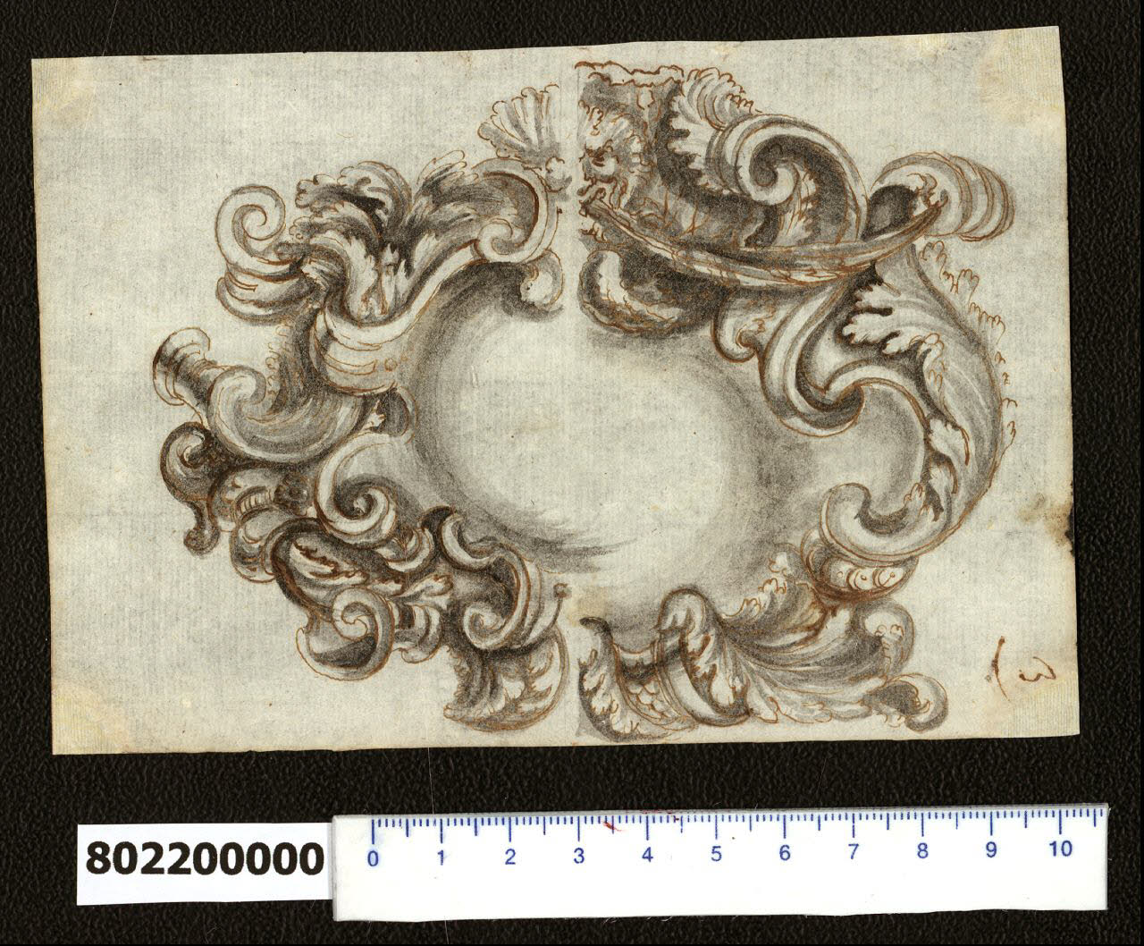 - NOTIZIE STORICO CRITICHE Nell'"Indice" del tomo nel quale era rilegato il disegno viene definito: "Cartelle per ornato".\nIl disegno in esame rappresenta due versioni per una cartella che doveva probabilmente costituire l'ornamento di un edificio. Le due ipotesi progettuali sono raffigurate a metà, in quanto il disegno si sarebbe ripetuto simmetricamente sul lato opposto e sono accostate in corrispondenza della mezzeria per un raffronto.\nNella prima cartella prevalgono i cartigli accartocciati che si avviluppano intorno a ciuffi di foglie d'acanto e il decoro si conclude nella parte superiore con una foglia a ventaglio; nella seconda le volute dei cartigli e le foglie d'acanto, accostate per contornare la parte centrale, sono trattenute in alto da un drappo che esce dalla bocca del mascherone superiore. \nIl tipo di rappresentazione e le caratteristiche ornamentali inducono ad inserire l'opera nell'ultimo quarto del XVII secolo.\nDa un raffronto con il disegno seguente (Milano, Collezione Sardini Martinelli inv. 8,22 bis) e con altri presenti all'interno della Collezione (Milano, Collezione Sardini Martinelli inv. 8,36), in cui si ravvisa analogia stilistica, si potrebbe ipotizzare in forma dubitativa l'attribuzione a Domenico Martinelli. L'ipotesi sarebbe rafforzata dalla presenza di un disegno di cartella molto più elaborata ma con un motivo molto simile di cartigli arricciati e foglie d'acanto, tra i fogli di un manoscritto di Martinelli (Biblioteca Statale di Lucca, ms. 1855, f. 38).