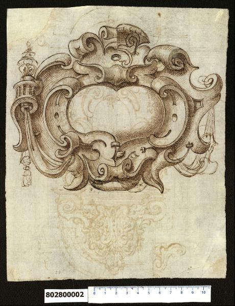 - NOTIZIE STORICO CRITICHE Il disegno in esame è escluso dall'"Indice" di Giacomo Sardini. Si tratta di una cartella per iscrizione presentata in due soluzioni alternative rispetto alla mezzeria, con cartigli arricciati in forme parzialmente differenti. In particolare la soluzione a sinistra presenta sul lato un cartiglio arrotolato che sostiene una sorta di tabernacolo e da cui fuoriesce un drappo collegato a un cartiglio sottostante. L'altro capo del drappo scende dietro la cartella e termina con un pennacchio. Anche sul lato destro si ripresenta il motivo del drappo sospeso tra cartigli ma lo stesso è appena accennato quasi fosse un velo e risulta seminascosto dietro la cartella. Il disegno presenta contorni nitidi e tratteggio incrociato a inchiostro per le ombreggiature che rilevano le forme.