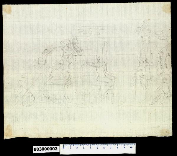 - NOTIZIE STORICO CRITICHE Il disegno, escluso dall'"Indice" di Giacomo Sardini, è tratteggiato velocemente a matita come quello sul Recto del foglio e rappresenta degli elementi scultorei per l'interno di una chiesa. Non è chiara la posizione di tali elementi, anche se una parte del disegno sulla sinistra sembra una vista dal basso verso l'alto di una decorazione angolare, dove una base cilindrica sorretta da una mensola a forma di conchiglia porta una cartella ovale sostenuta da putti e sovrastata da una testina coronata di cherubino. A quest'ultima è appoggiata una cornice ricurva sorretta da una figura "inginocchiata" con due volute su un basamento (telamone). Ad essa si rivolge con il braccio destro teso un'altra figura, forse maschile, seduta sul bordo della cornice del basamento. Quest'ultimo potrebbe essere parte di una balaustra.\nVerso il lato destro del foglio la rappresentazione continua, anche se poi è interrotta dal margine, con un fauno riconoscibile dalle zampe caprine seduto sulla base di una colonna, a cui è appoggiato con il dorso e che tiene con il braccio destro, sovrastata da una cornice su cui è seduta un'altra figura indefinita. Un'altra figura maschile è seduta alla base della composizione, mentre poco sopra un altro fauno sembra sorreggere con il dorso una cartella ovale. Due festoni collegano alla base le due composizioni raffigurate sul foglio.\nL'autore del disegno non è stato identificato, tuttavia il tratto grafico è associabile a quello dei disegni coi quali è raggruppato nell'"Indice" di Giacomo Sardini (Milano, Collezione Sardini Martinelli invv. 8,30 R e 8,31).