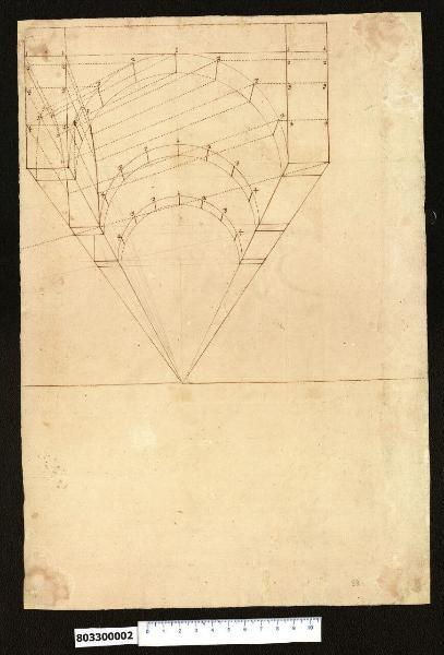 - NOTIZIE STORICO CRITICHE Il foglio non è menzionato nell'indice del volume nel quale il marchese Giacomo Sardini lo aveva rilegato. Dato che esso costituisce il verso di un disegno preparatorio per la decorazione ad affresco della volta di una sala attribuibile ad un artista centro italiano attivo nei primi decenni decenni del Settecento, anche per questo studio per la prospettiva centrale di un soffitto voltato si può ipotizzare l'appartenenza ad un analogo ambito geografico e cronologico. Potrebbe trattarsi dell'esercitazione condotta da un pittore quadraturista in previsione dell'ornamentazione di una volta strutturata secondo una prospettiva centrale con la finalità di ingannare l'occhio dell'osservatore suggerendo una maggiore profondità dello spazio rispetto a quella reale.