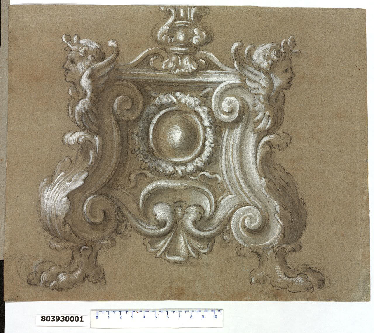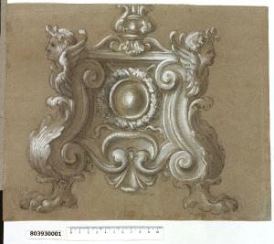 - NOTIZIE STORICO CRITICHE Si tratta di un ripensamento, che potrebbe costituire la soluzione finale scelta, della base del candelabro con braciere di cui all'inv. 8,39ter R, il cui supporto è applicato da un lato per sovrapporsi.\nIl disegno in esame riporta infatti su entrambe i lati della base del candelabro la soluzione in precedenza prevista sul lato sinistro, mentre la base stessa ha subito una variazione di forma e di decorazione, in quanto le volute laterali prima accostate ora sono parte integrante di essa e nella parte centrale compaiono dei cartocci e un tondo circondato da una corona floreale intrecciata con nastri.\nIl disegno ha assonanze decorative con le basi dei candelieri del'altare di S. Ignazio nella Chiesa del Gesù e dell'altare di S. Luigi nella chiesa di S. Ignazio a Roma, entrambi di Andrea Pozzo.\nUn confronto può essere fatto anche con i disegni di candelieri e altri oggetti liturgici, alcuni anche appartenenti al lucchese Gerolamo Scaglia, che si trovano in uno dei manoscritti di Martinelli (Biblioteca Statale di Lucca, ms 1855).