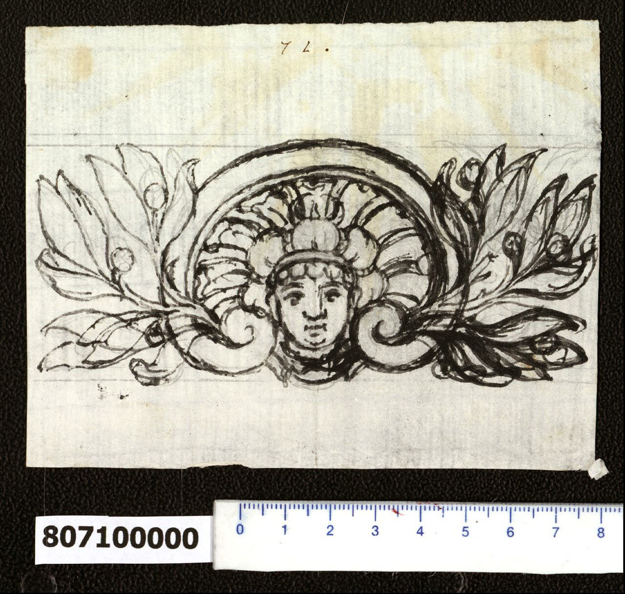 - NOTIZIE STORICO CRITICHE Nell'"Indice" del tomo nel quale era rilegato il disegno viene definito: "Maschera in una nicchia". \nIl disegno in esame riporta un elemento decorativo che sembra appartenere a una cornice di elemento architettonico. Si ipotizza che sia stato realizzato da Domenico Martinelli durante il primo periodo di permanenza a Roma, per analogia stilistica e per la ricorrenza di soggetti simili nei suoi apparati decorativi. Il disegno raffigura una testina femminile con aureola di petali racchiusa da una cornice arrotondata che termina in due volute in corrispondenza del viso. Dalle volute si dipartono due rami con foglie e frutti o bacche, forse di alloro.\nUn motivo molto simile si trova nella semicupola sopra l'altare della chiesa dei SS. Luca e Martina in Roma di Pietro da Cortona, autore che utilizzò in diversi apparati decorativi il tipo di cornice arrotondata.