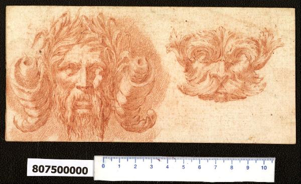 - NOTIZIE STORICO CRITICHE Nell'"Indice" del tomo nel quale era rilegato il disegno viene definito: "due Maschere".\nIl disegno in esame, rifinito accuratamente con matita rossa, rappresenta a sinistra una maschera dal volto di uomo anziano con barba e baffi, il cui capo, affiancato da due cornucopie vuote, è circondato da fronde vegetali in sostituzione della capigliatura. La maschera rappresentata a destra ha pure le sembianze di un vecchio con folti baffi, ma è completamente trasfigurata dagli elementi vegetali che ne compongono i lineamenti.\nIl disegno è da associare stilisticamente a quello di cui all'inv. 8,73 della presente Collezione.