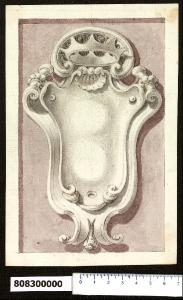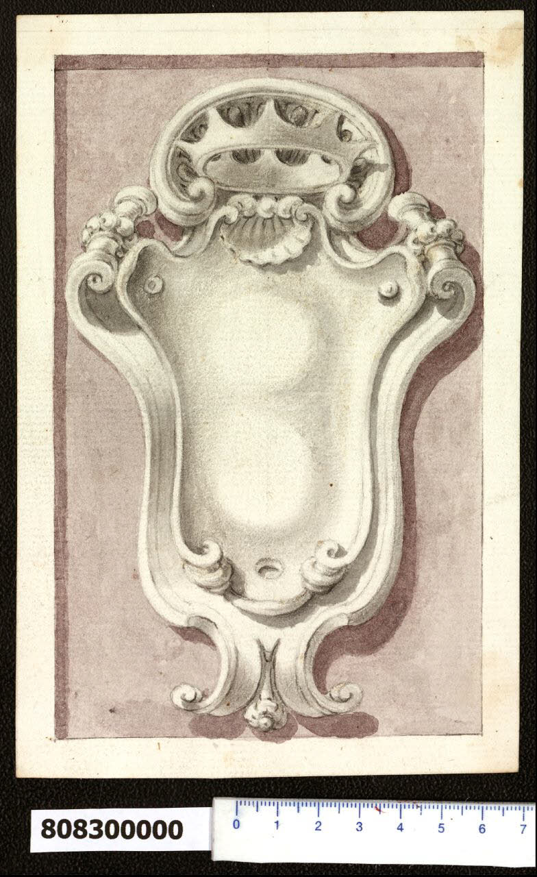 - NOTIZIE STORICO CRITICHE Nell'"Indice" del tomo nel quale era rilegato il disegno viene definito: "Cartelle per armi".\nScudo gentilizio definito da una cornice a volute e ornato al vertice da una conchiglia con sovrastante corona. Lorenz (1991, MZ 448) conferma l'attribuzione a Domenico Martinelli.