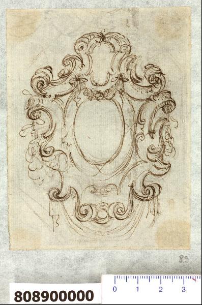 - NOTIZIE STORICO CRITICHE Nell'"Indice" del tomo nel quale era rilegato il disegno viene raggruppato con altri sotto il titolo: "Cartelle per armi ".\nIl foglio in esame presenta una cartella per ornato attribuita da Hellmut Lorenz a Domenico Martinelli. Il disegno sembra stilisticamente associabile a uno schizzo presente nello stesso tomo (Milano, Sardini Martinelli inv. 8,28 R). \nL'ornato è costituito da due cartelle sovrapposte vuote, di cui la principale di forma ovale e quella superiore più piccola sagomata, contornate da cartigli con volute. Tra le due campiture una ghirlanda appesa in corrispondenza di due fiocchi, mentre altre due ghirlande pendono da due volute laterali. Un drappo di tessuto è appeso alla base tra altre due volute di cartiglio.