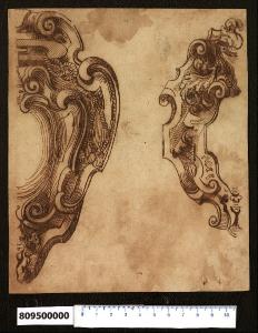 - NOTIZIE STORICO CRITICHE Nell'"Indice" del tomo nel quale era rilegato il disegno viene raggruppato con altri sotto il titolo: "Cartelle per / armi di Gio. Batta Montani".\nIl foglio presenta due metà di cartelle per arme disegnate da Giovanni Battista Montano. L'attribuzione di Giacomo Sardini è confermata dalla presenza di altri disegni quasi identici dello stesso autore raccolti in un album lasciato in eredità da Henri de Cambout, Duca di Coislin al Monastero di Saint Germain des Prés nel 1732 (MS Hb, 22 - 4°, ff. 103, 104, 107 consultati nei microfilm 9421, 9422, 9423), oggi conservato presso la Bibliothèque National de France a Parigi e segnalato da Lynda Fairbairn (Italian Renaissance Drawings from the Collection of Sir John Soane's Museum, London, 1998 pp. 770-771). Della prima cartella di tipo ecclesiastico, è rappresentata la parte destra con la linea di mezzeria in prossimità del margine sinistro del foglio; gli elementi decorativi distintivi collocati tra le volute dei cartigli, sono il cappello prelatizio con l'ampia tesa trapassata dal cordone annodato che termina con una serie di fiocchi e due testine poste rispettivamente alla sommità e all'apice inferiore della parte centrale vuota della cartella.\nDella seconda cartella di tipo gentilizio, è tracciata la parte sinistra con la mezzeria accostata al margine destro; in questo caso al posto del cappello prelatizio è raffigurato un elmo con ai lati foglie d'acanto e un cordone che fuoriesce da un cartiglio. La parte centrale ha il contorno sagomato e termina con una maschera appena abbozzata. \nIl disegno può essere correlato ad altri presenti all'interno della Collezione (Milano, Collezione Sardini Martinelli, invv. 8,96; 8,97; 8,98; 8,99; 8,100; 8,101).