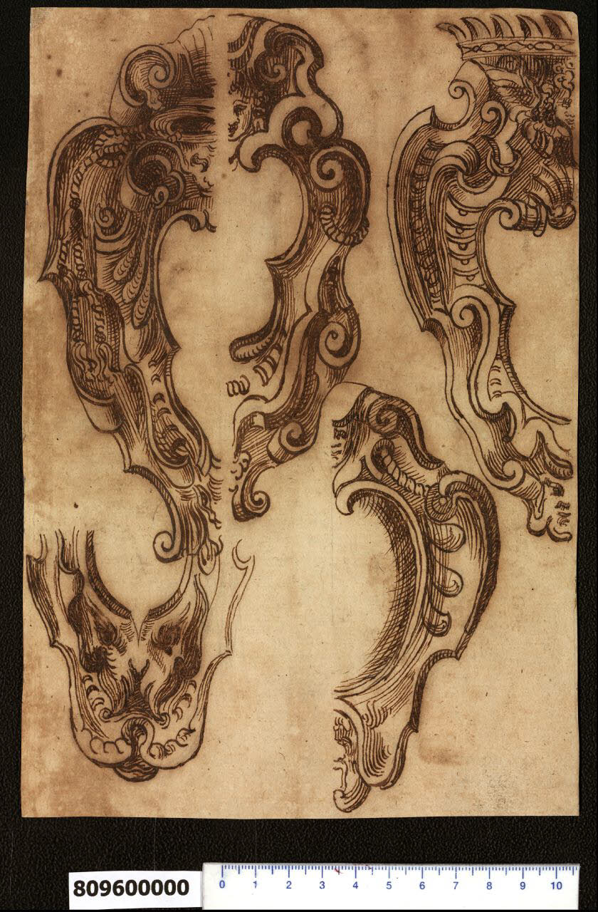 - NOTIZIE STORICO CRITICHE Nell'"Indice" del tomo nel quale era rilegato il disegno viene raggruppato con altri sotto il titolo: "Cartelle per / armi di Gio. Batta Montani".\nIl foglio presenta cinque cartelle per arme (di cui è raffigurata solo una metà essendo l'altra simmetrica) disegnate da Giovanni Battista Montano. L'attribuzione di Giacomo Sardini è confermata dalla presenza di altri disegni quasi identici dello stesso autore raccolti in un album lasciato in eredità da Henri de Cambout, Duca di Coislin al Monastero di Saint Germain des Prés nel 1732 (MS Hb, 22 - 4°, ff. 103, 104, 107 consultati nei microfilm 9421, 9422, 9423), oggi conservato presso la Bibliothèque National de France a Parigi e segnalato da Lynda Fairbairn (Italian Renaissance Drawings from the Collection of Sir John Soane's Museum, London, 1998 pp. 770-771).\nLa prima cartella è di tipo ecclesiastico e ne è rappresentata la parte sinistra; gli elementi decorativi distintivi collocati tra le volute dei cartigli, sono il cappello prelatizio con l'ampia tesa trapassata dal cordone annodato che termina con una serie di fiocchi e una testa di leone posta alla sommità della parte centrale vuota della cartella, dal contorno sagomato. \nA questa cartella si contrappone una seconda, raffigurata nella metà destra, con cartigli arricciati, trapassati da un cordone e una testina femminile alla sommità della parte centrale vuota della cartella, dal contorno sagomato. \nSulla destra del foglio con la mezzeria a ridosso del margine, è rappresentata la parte sinistra della terza cartella gentilizia, contraddistinta nella parte alta da una testina alata posta sopra una conchiglia e sormontata da una corona principesca; in basso la cartella, il cui cartigli sono decorati nell'incavo, è conclusa da una maschera.\nLa quarta cartella, appare sulla parte bassa a sinistra del foglio ed è rappresentata solo nella zona inferiore, ad illustrare il dettaglio della testa di leone stilizzata, circondata da un cartiglio sagomato e arricciato.\nL'ultima cartella, posta nella parte centrale in basso, è raffigurata nella metà destra, con cartigli arricciati, trapassati da un cordone e una testina femminile alla sommità della parte centrale vuota della cartella e termina sul fondo con una maschera. \nIl disegno può essere correlato ad altri presenti all'interno della Collezione (Milano, Collezione Sardini Martinelli, invv. 8,95; 8,97; 8,98; 8,99; 8,100; 8,101).