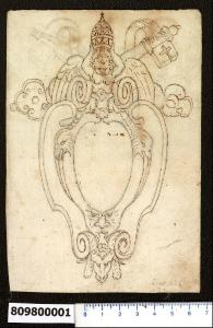 - NOTIZIE STORICO CRITICHE Nell'"Indice" del tomo nel quale era rilegato il disegno viene raggruppato con altri sotto il titolo: "Cartelle per / armi di Gio. Batta Montani".\nIl foglio presenta una cartella per arme papale attribuita da Giacomo Sardini a Giovanni Battista Montano. Il disegno si discosta però sia graficamente sia iconologicamente da quelli del gruppo nel quale è inserito da Sardini. Nemmeno l'iscrizione presente alla base del foglio, poco leggibile, consente di chiarire a quale pontefice sia dedicata.\nLa parte centrale vuota della cartella, a forma di ovale, è attorniata da una cornice con due maschere alla sommità e alla base e due teste di rapace ai lati; un cartiglio circonda la cornice e racchiude tra le sue volute un agnello, simbolo di Cristo, alla base e un putto alato che sorregge con le braccia al di sopra della testa la tiara. Dietro questa figura sono poste le chiavi incrociate legate da nastri.