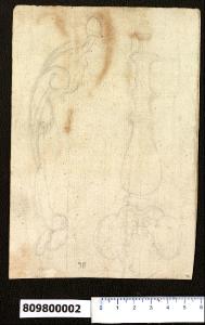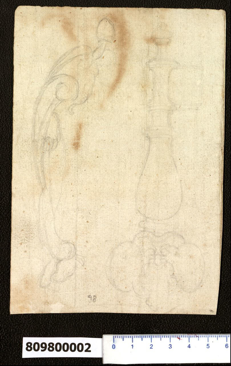 - NOTIZIE STORICO CRITICHE Il disegno è escluso dall'"Indice" di Giacomo Sardini. Si tratta di due schizzi eseguiti a grafite: il primo relativo a una cartella per arme vescovile, riconoscibile dalla tiara appena abbozzata e il secondo rappresentante un candeliere, definito solo nella sagoma esterna. Non vi sono elementi per poter identificare più precisamente i due soggetti, né confermare l'attribuzione a Giovanni Battista Montano.