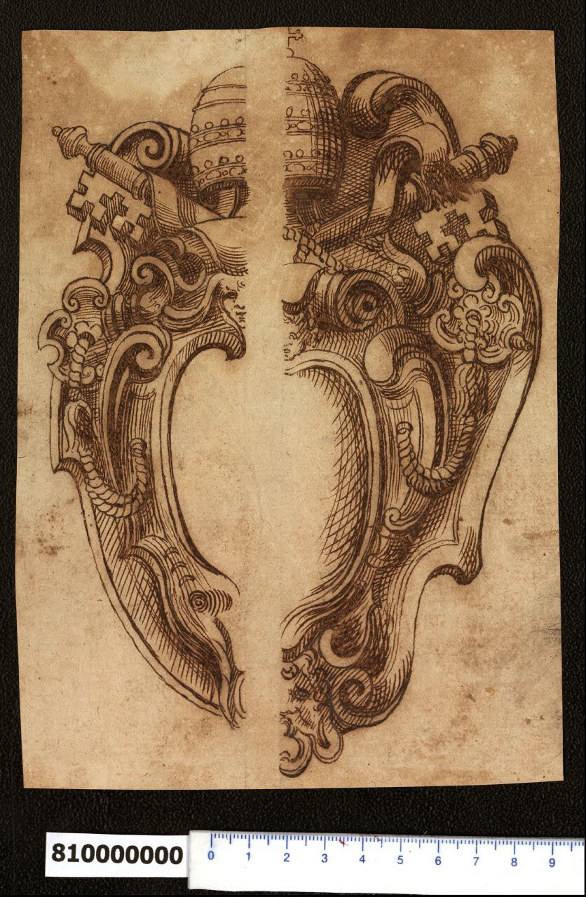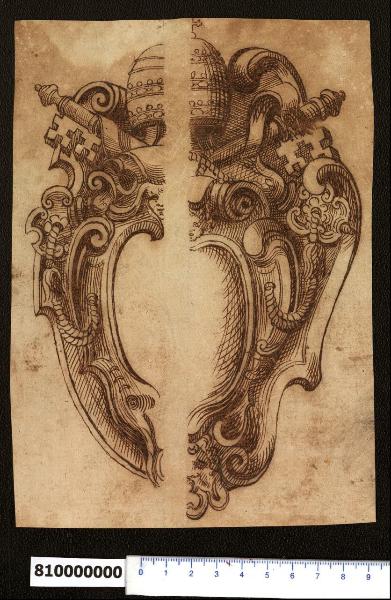 - NOTIZIE STORICO CRITICHE Nell'"Indice" del tomo nel quale era rilegato il disegno viene raggruppato con altri sotto il titolo: "Cartelle per / armi di Gio. Batta Montani".\nIl foglio presenta due cartelle per arme papali (di cui è raffigurata solo una metà essendo l'altra simmetrica), disegnate da Giovanni Battista Montano. L'attribuzione di Giacomo Sardini è confermata dalla pesenza di altri disegni quasi identici dello stesso autore raccolti in un manoscritto (MS Hb, 22 - 4°, ff. 103, 104, 107 consultati nei microfilm 9421, 9422, 9423), oggi conservato presso la Bibliothèque National de France a Parigi e segnalato da Lynda Fairbairn (Italian Renaissance Drawings from the Collection of Sir John Soane's Museum, London, 1998 pp. 770-771).\nSi tratta di due soluzioni messe a confronto, che riportano variamente disposti e disegnati gli stessi elementi caratteristici delle insegne papali: la tiara, le chiavi (in questo caso ne appare una sola, ma il disegno è simmetrico) e il cordone con fiocchi che si snoda dentro e fuori dal cartiglio arrotolato in volute a contorno di uno spazio centrale vuoto. Nella seconda cartella è aggiunta una maschera all'apice inferiore.\nLa tiara, copricapo liturgico di forma semi-ovale, era generalmente guarnita con tre corone d'oro, due nastri uscenti dalla parte posteriore e un pomello sormontato da una piccola croce sulla parte superiore (in questo caso omesso forse perché il disegno termina al limite superiore del foglio). Emblema primario del papato, rappresenta la dignità del sommo pontefice quale capo supremo della chiesa e sovrano dello Stato pontificio.\nLe chiavi, una'oro e una d'argento disposte a croce di S. Andrea e legate da un nastro, con le impugnature verso il basso collegate dal cordone e i congegni di apertura a forma di croce rivolti verso l'alto, simboleggiano la giurisdizione, ossia la piena autorità del pontefice ad amministrare i tesori della Redenzione e ad insegnare con autorità la dottrina di Gesù.In particolare la chiave d'argento, posta a sinistra, simboleggia l'autorità del papato sulla terra, mentre la chiave d'oro a destra allude al potere che si estende al regno dei cieli.\nIl disegno è correlato ad altri presenti all'interno della Collezione (Milano, Collezione Sardini Martinelli, invv. 8,95; 8,96; 8,97; 8,98; 8,99; 8,101) e in particolare sembra trattarsi di una variante per le soluzioni di cui al disegno precedente (Milano, Collezione Sardini Martinelli, inv. 8,99).