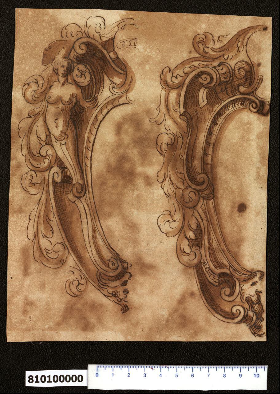 - NOTIZIE STORICO CRITICHE Nell'"Indice" del tomo nel quale era rilegato il disegno viene raggruppato con altri sotto il titolo: "Cartelle per / armi di Gio. Batta Montani".\nIl foglio presenta due cartelle per arme gentilizie (di cui è raffigurata solo una metà essendo l'altra simmetrica), disegnate da Giovanni Battista Montano. L'attribuzione di Giacomo Sardini è confermata dalla presenza di altri disegni quasi identici dello stesso autore raccolti in un album lasciato in eredità da Henri de Cambout, Duca di Coislin al Monastero di Saint Germain des Prés nel 1732 (MS Hb, 22 - 4°, ff. 103, 104, 107 consultati nei microfilm 9421, 9422, 9423), oggi conservato presso la Bibliothèque National de France a Parigi e segnalato da Lynda Fairbairn (Italian Renaissance Drawings from the Collection of Sir John Soane's Museum, London, 1998 pp. 770-771).\nSi tratta di due soluzioni, di cui è rappresentato il solo lato sinistro. La prima cartella presenta l'ovale centrale sovrastato da un elmo appena delineato e affiancato da un nudo femminile, probabilmente un'erma appoggiata al cartiglio sottostante sorretto da una maschera. Dall'elmo si dipartono cartigli e foglie d'acanto che attorniano l'erma e completano il decoro della cartella.\nLa seconda cartella, più grande, riporta una variante dello stesso motivo di cartigli arrotolati affiancati da foglie d'acanto, senza l'erma laterale ma con una testa di leone più pronunciata sul fondo, mentre dell'elmo superiore si intuisce solo la sagoma esterna.\nIl disegno è correlato ad altri presenti all'interno della Collezione (Milano, Collezione Sardini Martinelli, invv. 8,95; 8,96; 8,97; 8,98; 8,99; 8,100).