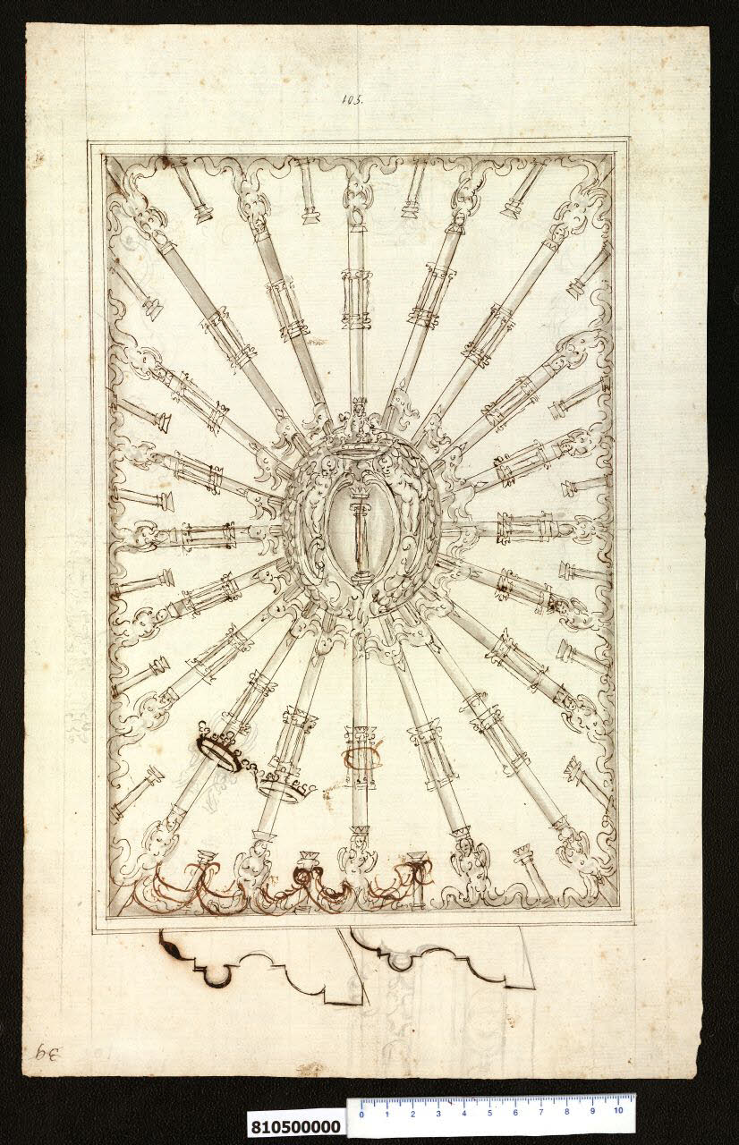 - NOTIZIE STORICO CRITICHE Nell'"Indice" del tomo nel quale era rilegato il disegno viene definito: "Intagli per una partita di / dietro d'una carrozza e per / un soffitto del Cielo della med.a / ideati per il Cardinal Colonna".\nIl disegno raffigura la copertura della carrozza del cardinale Colonna (probabilmente Girolamo 1628-66). Il telo è ricamato con le imprese della famiglia (le colonne) disposte a raggiera attorno allo stemma centrale; quest'ultimo è costituito da un medaglione ovale contenente una colonna sormontata da corona retta da due figure. Nella parte inferiore del foglio sono raffigurate le modanature della cornice che corre attorno alla carrozza.