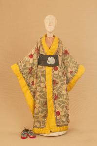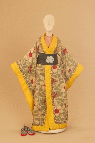 Costume folcloristico da donna giapponese composto da veste, kimono, obi e sandali.