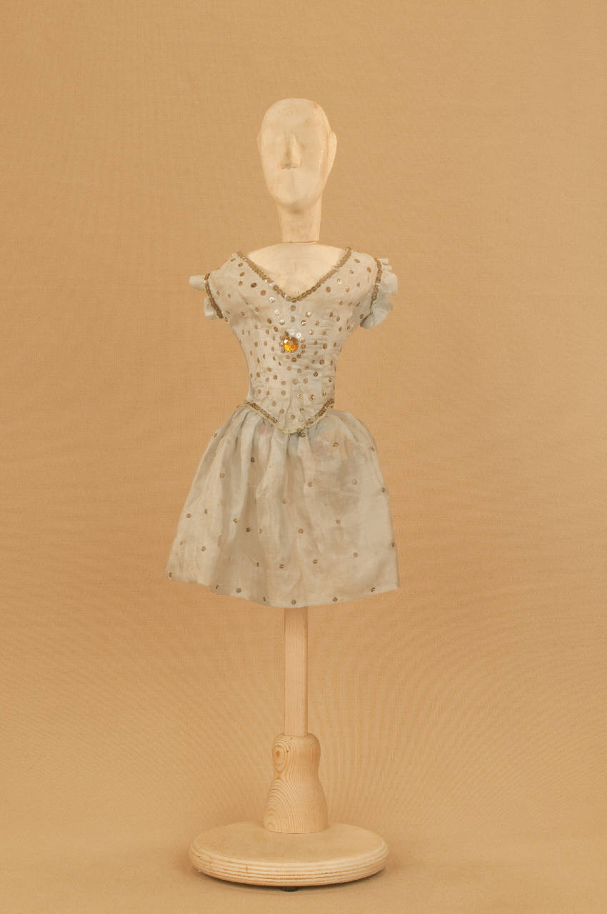 - NOTIZIE STORICO CRITICHE Costume realizzato per Il ballo "Excelsior", spettacolo che fu rappresentato la prima volta a Milano, al Teatro alla Scala, la sera dell'11 gennaio 1881. Autore del libretto e della coreografia era Luigi Manzotti, mentre Romualdo Marengo lo era della musica e Alfredo Edel delle scene e dei costumi.\nIl successo del ballo fu travolgente. Le repliche furono 103 nella stagione.\nLa versione marionettistica per la Compagnia Carlo Colla e Figli in due tempi e undici quadri fu allestita da Carlo II Colla col consenso dell'autore e presentata col titolo di "Civiltà e Progresso" nel 1895. Il titolo mutò poi nel tempo. Il primo allestimento del ballo ricordava ancora troppo l'originale scaligero. Ma fu sufficiente che lo spettacolo entrasse nella routine degli spostamenti della Compagnia perché le peculiarità del teatro marionettistico diventassero preponderanti.\nCosì l'"Excelsior" approdò al Teatro Gerolamo di Milano, quando la Compagnia ci entrò stabilmente nel 1906, proprio negli anni in cui, dopo qualche ultima apparizione, il "ballo grande" italiano, simbolico-narrativo sta tramontando sulle scene europee, divenendo unico retaggio del teatro delle marionette e, più particolarmente, della Compagnia Carlo Colla e Figli che ha continuato a riproporlo sino ad oggi, offrendo al pubblico di un secolo dopo la più vivida testimonianza del kolossal scaligero. Da nota scritta a matita sul "Giro Piazze della Compagnia Carlo Colla e Figli 1883-1912" si evince che la prima rappresentazione del ballo "Excelsior" è stata fatta a Caluso (TO) nel 1895.