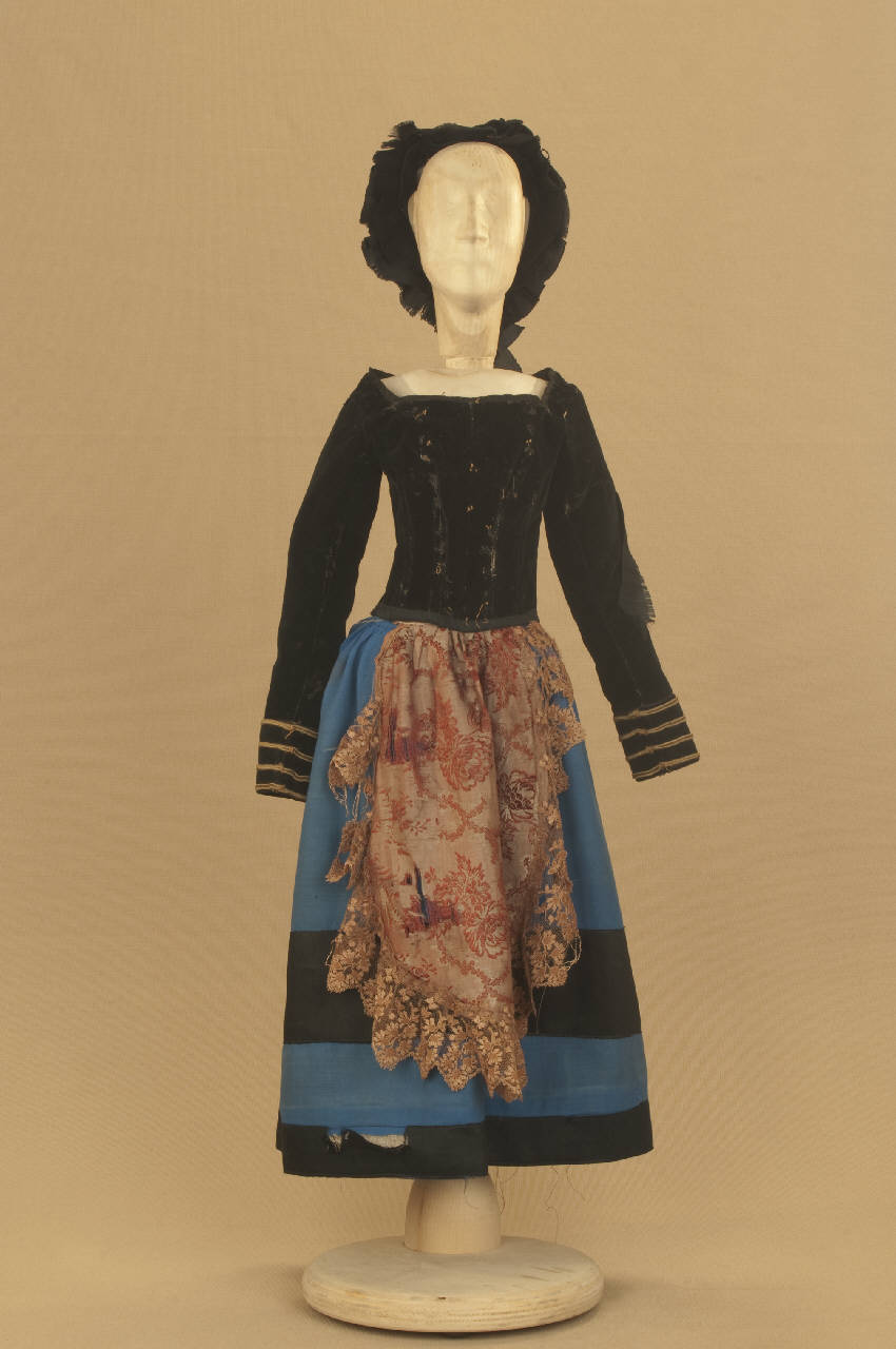 Costume da donna borghese composto da gonna, corpino, grembiule e cuffia.