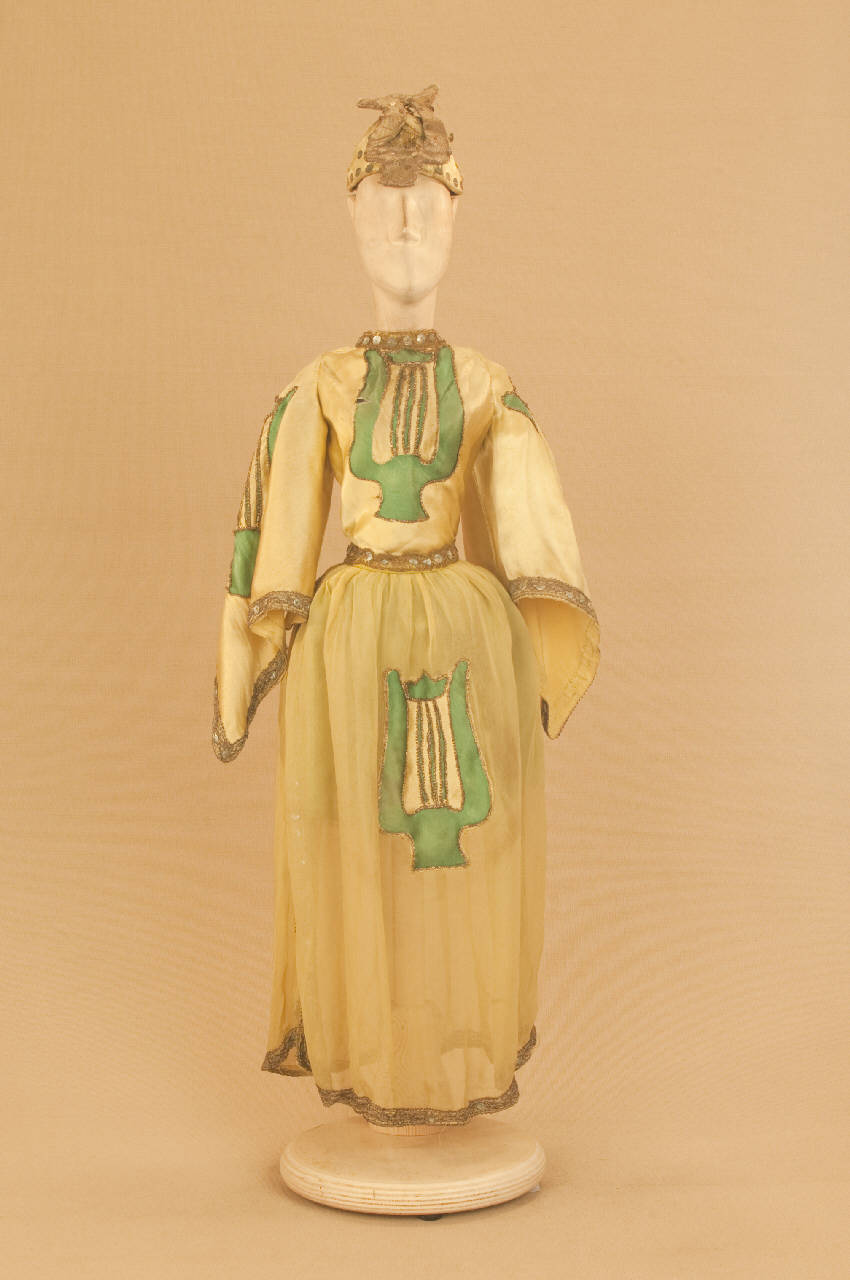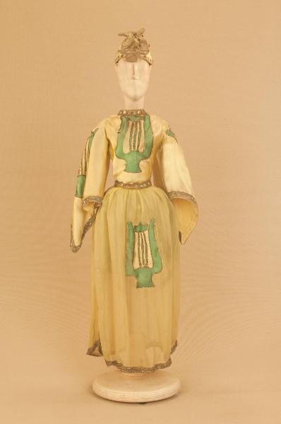 - NOTIZIE STORICO CRITICHE Costume realizzato per Il ballo "Excelsior", spettacolo che fu rappresentato la prima volta a Milano, al Teatro alla Scala, la sera dell'11 gennaio 1881. Autore del libretto e della coreografia era Luigi Manzotti, mentre Romualdo Marengo lo era della musica e Alfredo Edel delle scene e dei costumi.\nIl successo del ballo fu travolgente. Le repliche furono 103 nella stagione.\nLa versione marionettistica per la Compagnia Carlo Colla e Figli in due tempi e undici quadri fu allestita da Carlo II Colla col consenso dell'autore e presentata col titolo di "Civiltà e Progresso" nel 1895. Il titolo mutò poi nel tempo. Il primo allestimento del ballo ricordava ancora troppo l'originale scaligero. Ma fu sufficiente che lo spettacolo entrasse nella routine degli spostamenti della Compagnia perché le peculiarità del teatro marionettistico diventassero preponderanti.\nCosì l'"Excelsior" approdò al Teatro Gerolamo di Milano, quando la Compagnia ci entrò stabilmente nel 1906, proprio negli anni in cui, dopo qualche ultima apparizione, il "ballo grande" italiano, simbolico-narrativo sta tramontando sulle scene europee, divenendo unico retaggio del teatro delle marionette e, più particolarmente, della Compagnia Carlo Colla e Figli che ha continuato a riproporlo sino ad oggi, offrendo al pubblico di un secolo dopo la più vivida testimonianza del kolossal scaligero. Da nota scritta a matita sul "Giro Piazze della Compagnia Carlo Colla e Figli 1883-1912" si evince che la prima rappresentazione del ballo "Excelsior" è stata fatta a Caluso (TO) nel 1895.