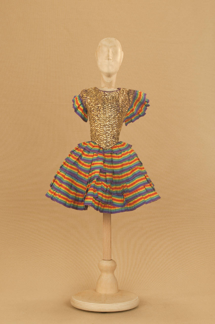 - NOTIZIE STORICO CRITICHE Costume realizzato per Il ballo "Excelsior", spettacolo che fu rappresentato la prima volta a Milano, al Teatro alla Scala, la sera dell'11 gennaio 1881. Autore del libretto e della coreografia era Luigi Manzotti, mentre Romualdo Marengo lo era della musica e Alfredo Edel delle scene e dei costumi.\nIl successo del ballo fu travolgente. Le repliche furono 103 nella stagione.\nLa versione marionettistica per la Compagnia Carlo Colla e Figli in due tempi e undici quadri fu allestita da Carlo II Colla col consenso dell'autore e presentata col titolo di "Civiltà e Progresso" nel 1895. Il titolo mutò poi nel tempo. Il primo allestimento del ballo ricordava ancora troppo l'originale scaligero. Ma fu sufficiente che lo spettacolo entrasse nella routine degli spostamenti della Compagnia perché le peculiarità del teatro marionettistico diventassero preponderanti.\nCosì l'"Excelsior" approdò al Teatro Gerolamo di Milano, quando la Compagnia ci entrò stabilmente nel 1906, proprio negli anni in cui, dopo qualche ultima apparizione, il "ballo grande" italiano, simbolico-narrativo sta tramontando sulle scene europee, divenendo unico retaggio del teatro delle marionette e, più particolarmente, della Compagnia Carlo Colla e Figli che ha continuato a riproporlo sino ad oggi, offrendo al pubblico di un secolo dopo la più vivida testimonianza del kolossal scaligero. Da nota scritta a matita sul "Giro Piazze della Compagnia Carlo Colla e Figli 1883-1912" si evince che la prima rappresentazione del ballo "Excelsior" è stata fatta a Caluso (TO) nel 1895.