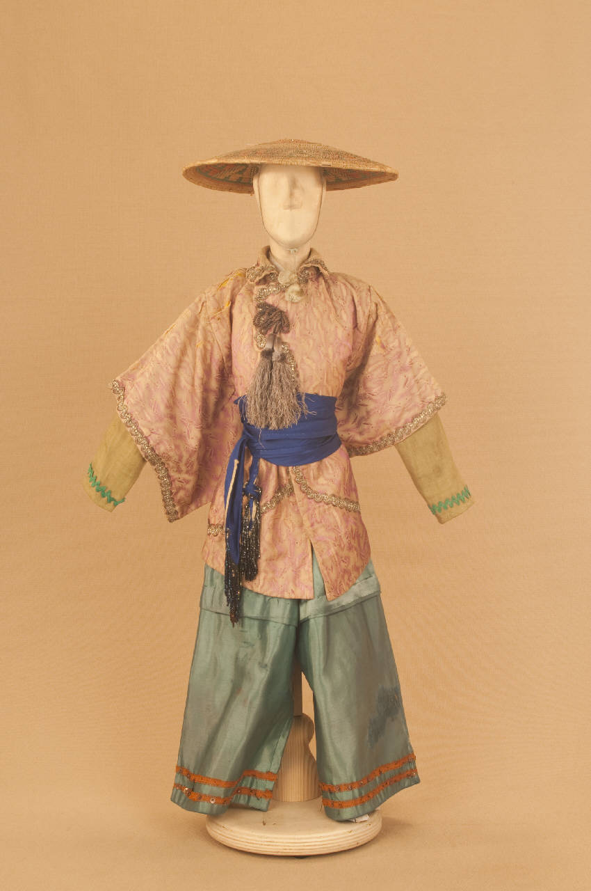 Costume folcloristico da uomo giapponese composto da pantaloni, corpino, kimono, fusciacca, collo, cappello e soggolo.