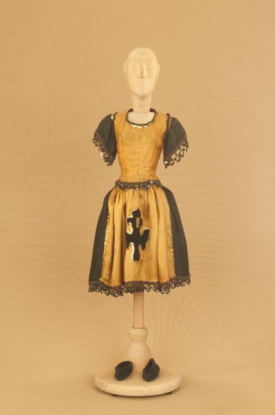 - NOTIZIE STORICO CRITICHE Costume realizzato in occasione del Festival di Spoleto del 1990 per il riallestimento del ballo "Excelsior", spettacolo che fu rappresentato la prima volta a Milano, al Teatro alla Scala, la sera dell'11 gennaio 1881. Autore del libretto e della coreografia è Luigi Manzotti, mentre Romualdo Marengo lo è della musica e Alfredo Edel delle scene e dei costumi.\nIl successo del ballo fu travolgente. Le repliche furono 103 nella stagione.\nLa versione marionettistica per la Compagnia Carlo Colla e Figli di questo in due tempi e undici quadri fu allestita da Carlo II Colla col consenso dell'autore e presentata col titolo di "Civiltà e Progresso" nel 1895. Il titolo mutò poi nel tempo. Il primo allestimento del ballo ricordava ancora troppo l'originale scaligero. Ma fu sufficiente che lo spettacolo entrasse nella routine degli spostamenti della Compagnia perché le peculiarità del teatro marionettistico diventassero preponderanti.\nCosì l'"Excelsior" approdò al Teatro Gerolamo di Milano, quando la Compagnia ci entrò stabilmente nel 1906, proprio negli anni in cui, dopo qualche ultima apparizione, il "ballo grande" italiano, simbolico-narrativo sta tramontando sulle scene europee, divenendo unico retaggio del teatro delle marionette e, più particolarmente, della Compagnia Carlo Colla e Figli che ha continuato a riproporlo sino ad oggi, offrendo al pubblico di un secolo dopo la più vivida testimonianza del kolossal scaligero. Da nota scritta a matita sul "Giro Piazze della Compagnia Carlo Colla e Figli 1883-1912" si evince che la prima rappresentazione del ballo "Excelsior" è stata fatta a Caluso (TO) nel 1895.