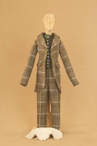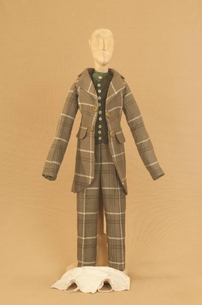 Costume da uomo borghese composto da pantaloni, giacca, gilet, cravatta e ghette.