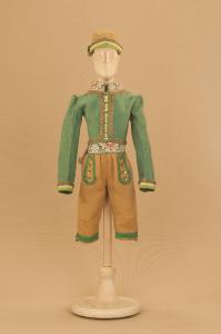- NOTIZIE STORICO CRITICHE Costume realizzato in occasione del Festival di Spoleto del 1990 per il riallestimento del ballo "Excelsior", spettacolo che fu rappresentato la prima volta a Milano, al Teatro alla Scala, la sera dell'11 gennaio 1881. Autore del libretto e della coreografia è Luigi Manzotti, mentre Romualdo Marengo lo è della musica e Alfredo Edel delle scene e dei costumi.\nIl successo del ballo fu travolgente. Le repliche furono 103 nella stagione.\nLa versione marionettistica per la Compagnia Carlo Colla e Figli di questo in due tempi e undici quadri fu allestita da Carlo II Colla col consenso dell'autore e presentata col titolo di "Civiltà e Progresso" nel 1895. Il titolo mutò poi nel tempo. Il primo allestimento del ballo ricordava ancora troppo l'originale scaligero. Ma fu sufficiente che lo spettacolo entrasse nella routine degli spostamenti della Compagnia perché le peculiarità del teatro marionettistico diventassero preponderanti.\nCosì l'"Excelsior" approdò al Teatro Gerolamo di Milano, quando la Compagnia ci entrò stabilmente nel 1906, proprio negli anni in cui, dopo qualche ultima apparizione, il "ballo grande" italiano, simbolico-narrativo sta tramontando sulle scene europee, divenendo unico retaggio del teatro delle marionette e, più particolarmente, della Compagnia Carlo Colla e Figli che ha continuato a riproporlo sino ad oggi, offrendo al pubblico di un secolo dopo la più vivida testimonianza del kolossal scaligero. Da nota scritta a matita sul "Giro Piazze della Compagnia Carlo Colla e Figli 1883-1912" si evince che la prima rappresentazione del ballo "Excelsior" è stata fatta a Caluso (TO) nel 1895.