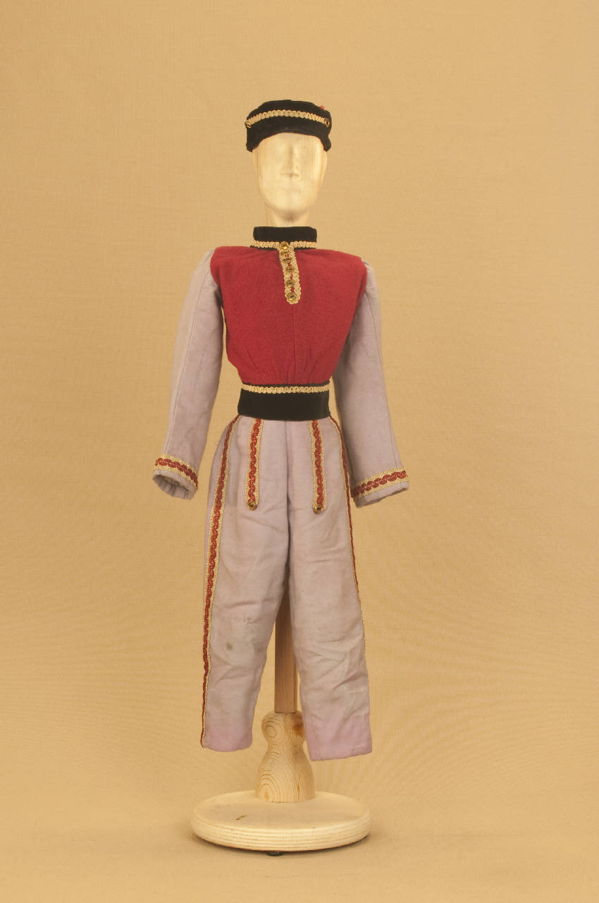- NOTIZIE STORICO CRITICHE Costume realizzato in occasione del Festival di Spoleto del 1990 per il riallestimento del ballo "Excelsior", spettacolo che fu rappresentato la prima volta a Milano, al Teatro alla Scala, la sera dell'11 gennaio 1881. Autore del libretto e della coreografia è Luigi Manzotti, mentre Romualdo Marengo lo è della musica e Alfredo Edel delle scene e dei costumi.\nIl successo del ballo fu travolgente. Le repliche furono 103 nella stagione.\nLa versione marionettistica per la Compagnia Carlo Colla e Figli di questo in due tempi e undici quadri fu allestita da Carlo II Colla col consenso dell'autore e presentata col titolo di "Civiltà e Progresso" nel 1895. Il titolo mutò poi nel tempo. Il primo allestimento del ballo ricordava ancora troppo l'originale scaligero. Ma fu sufficiente che lo spettacolo entrasse nella routine degli spostamenti della Compagnia perché le peculiarità del teatro marionettistico diventassero preponderanti.\nCosì l'"Excelsior" approdò al Teatro Gerolamo di Milano, quando la Compagnia ci entrò stabilmente nel 1906, proprio negli anni in cui, dopo qualche ultima apparizione, il "ballo grande" italiano, simbolico-narrativo sta tramontando sulle scene europee, divenendo unico retaggio del teatro delle marionette e, più particolarmente, della Compagnia Carlo Colla e Figli che ha continuato a riproporlo sino ad oggi, offrendo al pubblico di un secolo dopo la più vivida testimonianza del kolossal scaligero. Da nota scritta a matita sul "Giro Piazze della Compagnia Carlo Colla e Figli 1883-1912" si evince che la prima rappresentazione del ballo "Excelsior" è stata fatta a Caluso (TO) nel 1895.