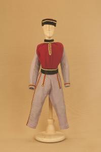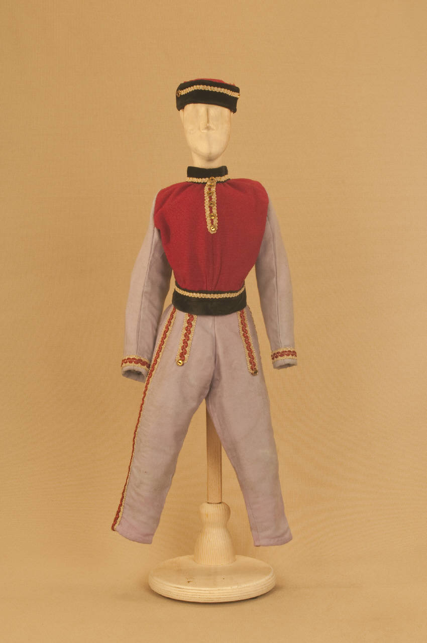 - NOTIZIE STORICO CRITICHE Costume realizzato in occasione del Festival di Spoleto del 1990 per il riallestimento del ballo "Excelsior", spettacolo che fu rappresentato la prima volta a Milano, al Teatro alla Scala, la sera dell'11 gennaio 1881. Autore del libretto e della coreografia è Luigi Manzotti, mentre Romualdo Marengo lo è della musica e Alfredo Edel delle scene e dei costumi.\nIl successo del ballo fu travolgente. Le repliche furono 103 nella stagione.\nLa versione marionettistica per la Compagnia Carlo Colla e Figli di questo in due tempi e undici quadri fu allestita da Carlo II Colla col consenso dell'autore e presentata col titolo di "Civiltà e Progresso" nel 1895. Il titolo mutò poi nel tempo. Il primo allestimento del ballo ricordava ancora troppo l'originale scaligero. Ma fu sufficiente che lo spettacolo entrasse nella routine degli spostamenti della Compagnia perché le peculiarità del teatro marionettistico diventassero preponderanti.\nCosì l'"Excelsior" approdò al Teatro Gerolamo di Milano, quando la Compagnia ci entrò stabilmente nel 1906, proprio negli anni in cui, dopo qualche ultima apparizione, il "ballo grande" italiano, simbolico-narrativo sta tramontando sulle scene europee, divenendo unico retaggio del teatro delle marionette e, più particolarmente, della Compagnia Carlo Colla e Figli che ha continuato a riproporlo sino ad oggi, offrendo al pubblico di un secolo dopo la più vivida testimonianza del kolossal scaligero. Da nota scritta a matita sul "Giro Piazze della Compagnia Carlo Colla e Figli 1883-1912" si evince che la prima rappresentazione del ballo "Excelsior" è stata fatta a Caluso (TO) nel 1895.