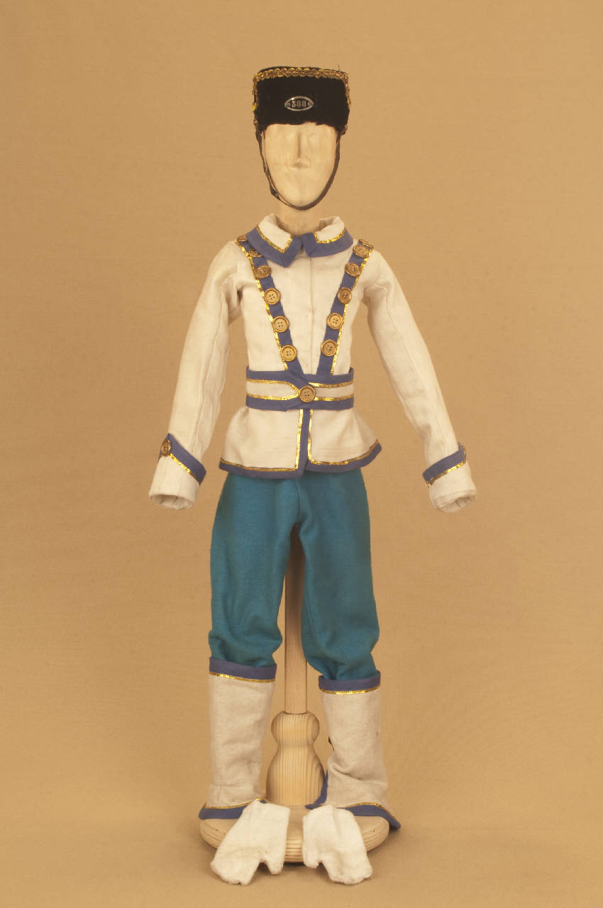 - NOTIZIE STORICO CRITICHE Il costume è stato realizzato nel 1997 per il riallestimento al teatro Vidy di Losanna nel gennaio 1998, del ballo "Excelsior", spettacolo che fu rappresentato la prima volta a Milano, al Teatro alla Scala, la sera dell'11 gennaio 1881. Il cappello è stato confezionato precedentemente, nel 1977, dalla Sig.ra Lina Codecasa, in occasione dell'andata in scena al Teatro Sociale di Como per le "Celebrazioni Voltiane", abbinato al costume del "Fattorino del telegrafo ed. A". Autore del libretto e della coreografia del ballo è Luigi Manzotti, mentre Romualdo Marengo lo è della musica e Alfredo Edel delle scene e dei costumi.\nIl successo del ballo fu travolgente. Le repliche furono 103 nella stagione.\nLa versione marionettistica per la Compagnia Carlo Colla e Figli in due tempi e undici quadri fu allestita da Carlo II Colla col consenso dell'autore e presentata col titolo di "Civiltà e Progresso" nel 1895. Il titolo mutò poi nel tempo. Il primo allestimento del ballo ricordava ancora troppo l'originale scaligero. Ma fu sufficiente che lo spettacolo entrasse nella routine degli spostamenti della Compagnia perché le peculiarità del teatro marionettistico diventassero preponderanti.\nCosì l'"Excelsior" approdò al Teatro Gerolamo di Milano, quando la Compagnia ci entrò stabilmente nel 1906, proprio negli anni in cui, dopo qualche ultima apparizione, il "ballo grande" italiano, simbolico-narrativo sta tramontando sulle scene europee, divenendo unico retaggio del teatro delle marionette e, più particolarmente, della Compagnia Carlo Colla e Figli che ha continuato a riproporlo sino ad oggi, offrendo al pubblico di un secolo dopo la più vivida testimonianza del kolossal scaligero. Da nota scritta a matita sul "Giro Piazze della Compagnia Carlo Colla e Figli 1883-1912" si evince che la prima rappresentazione del ballo "Excelsior" è stata fatta a Caluso (TO) nel 1895.