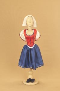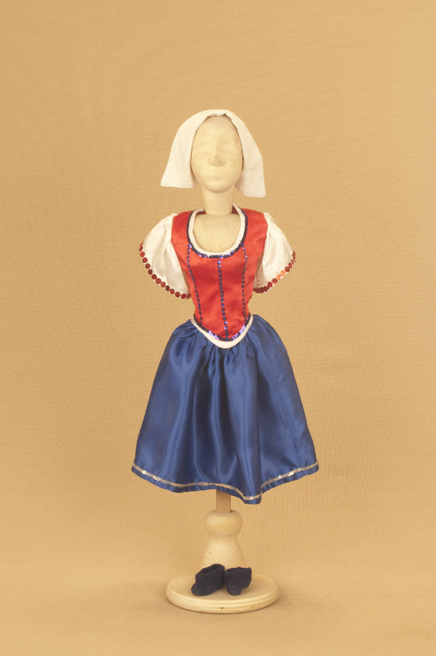 - NOTIZIE STORICO CRITICHE Costume realizzato nel 1999 per il riallestimento, al Piccolo Teatro di Milano, del ballo "Excelsior", spettacolo che fu rappresentato la prima volta a Milano, al Teatro alla Scala, la sera dell'11 gennaio 1881. Autore del libretto e della coreografia è Luigi Manzotti, mentre Romualdo Marengo lo è della musica e Alfredo Edel delle scene e dei costumi.\nIl successo del ballo fu travolgente. Le repliche furono 103 nella stagione.\nLa versione marionettistica per la Compagnia Carlo Colla e Figli in due tempi e undici quadri fu allestita da Carlo II Colla col consenso dell'autore e presentata col titolo di "Civiltà e Progresso" nel 1895. Il titolo mutò poi nel tempo. Il primo allestimento del ballo ricordava ancora troppo l'originale scaligero. Ma fu sufficiente che lo spettacolo entrasse nella routine degli spostamenti della Compagnia perché le peculiarità del teatro marionettistico diventassero preponderanti.\nCosì l'"Excelsior" approdò al Teatro Gerolamo di Milano, quando la Compagnia ci entrò stabilmente nel 1906, proprio negli anni in cui, dopo qualche ultima apparizione, il "ballo grande" italiano, simbolico-narrativo sta tramontando sulle scene europee, divenendo unico retaggio del teatro delle marionette e, più particolarmente, della Compagnia Carlo Colla e Figli che ha continuato a riproporlo sino ad oggi, offrendo al pubblico di un secolo dopo la più vivida testimonianza del kolossal scaligero. Da nota scritta a matita sul "Giro Piazze della Compagnia Carlo Colla e Figli 1883-1912" si evince che la prima rappresentazione del ballo "Excelsior" è stata fatta a Caluso (TO) nel 1895.