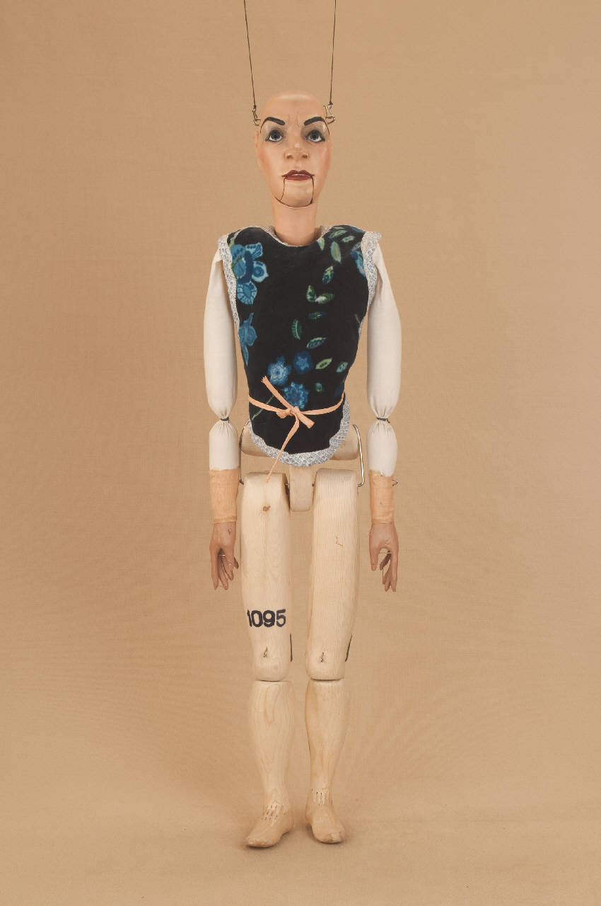Testa di legno di tiglio fissata al corpo tramite ferro, occhi di vetro, bocca mobile. Corpo grande in abete snodato in vita ad incastro, gambe unite al bacino tramite bordione in ferro, ginocchia ad incastro, mani mobili al polso con dita scolpite e separate, bilancino originale metodo Holden.