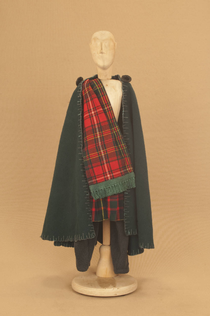 Costume da uomo scozzese composto da calzabraghe, kilt, sciarpa e mantello.