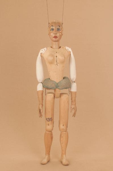 Testa in legno di tiglio fissata al corpo tramite ferro, occhi di vetro, bocca mobile. Corpo normale tagliato con doppio anello di raccordo, gambe unite al bacino tramite bordione in ferro, ginocchia ad incastro, mani mobili in tiglio con dita scolpite e separate, piedi piombati, bilancino originale a croce metodo Holden.