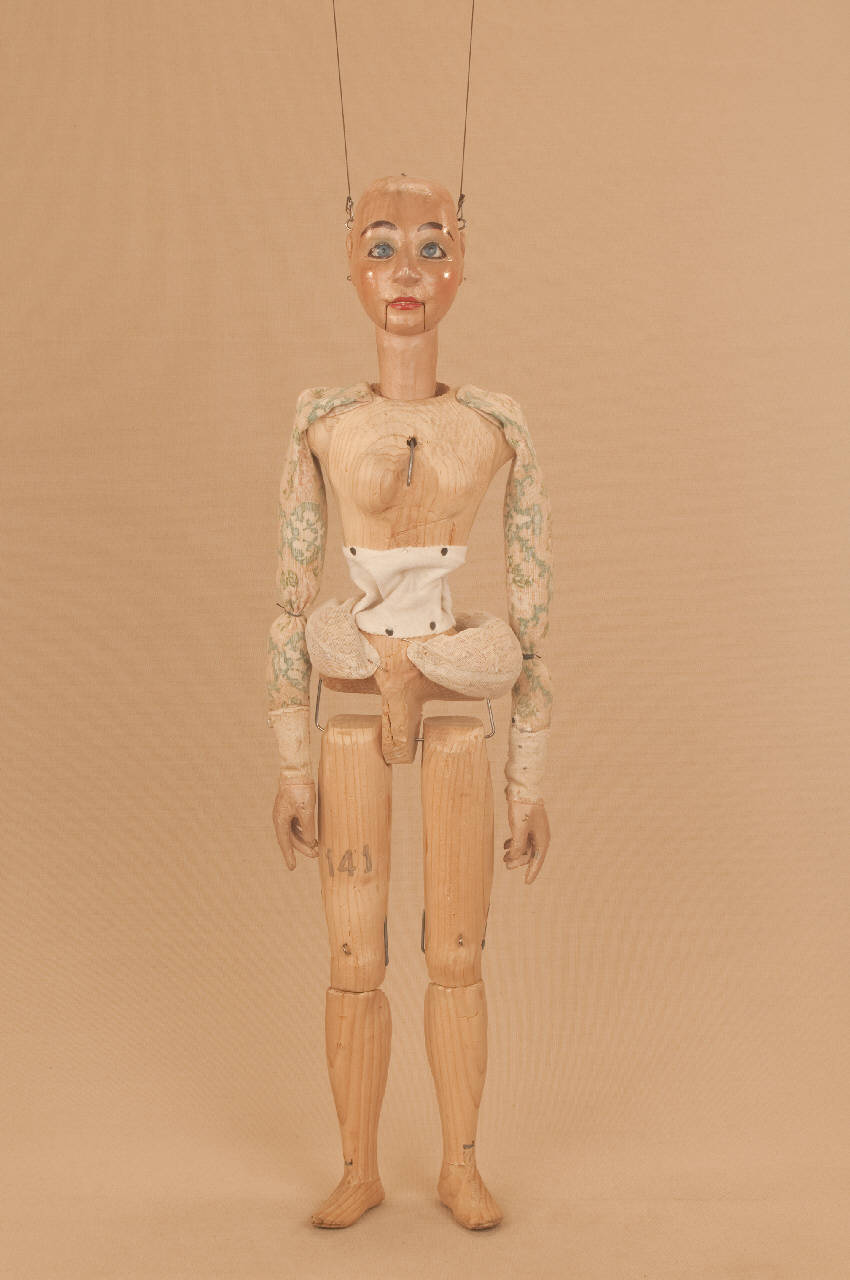 Testa in legno di tiglio fissata al corpo tramite ferro, occhi di vetro, bocca mobile. Corpo normale tagliato con doppio anello di raccordo, gambe unite al bacino tramite bordione in ferro, ginocchia ad incastro, mani mobili in tiglio con dita scolpite e separate, piedi piombati, bilancino originale a croce metodo Holden.