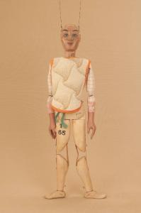 Testa in legno di tiglio fissata al corpo tramite ferro, occhi di vetro. Corpo normale in tiglio snodato in vita tramite anelli, Braccia in tela, gambe unite al bacino tramite incastro laterale per movimento tipico ballerini; ginocchia unite tramite lastrina di acciaio, mani rigide con dita scolpite e separate, piedi piombati, bilancino originale per ballerini.