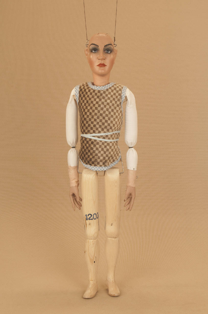 Testa di legno di tiglio fissata al corpo tramite ferro, occhi di vetro, bocca mobile. Corpo normale in abete snodato in vita ad incastro. Gambe unite al bacino tramite bordione in ferro, ginocchia ad incastro. Mani in tiglio con dita scolpite e separate. Piedi piombati. Bilancino a croce metodo Holden.