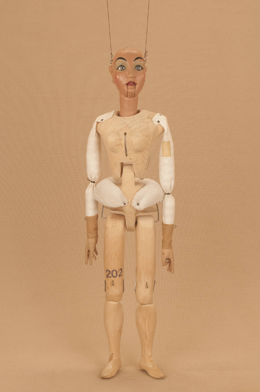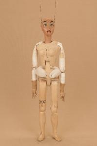 Testa di legno di tiglio fissata al corpo tramite ferro, occhi di vetro, bocca mobile. Corpo normale in abete snodato in vita ad incastro. Gambe unite al bacino tramite bordione in ferro, ginocchia ad incastro. Mani mobili in tiglio con dita scolpite e separate. Piedi piombati. Bilancino a croce metodo Holden.