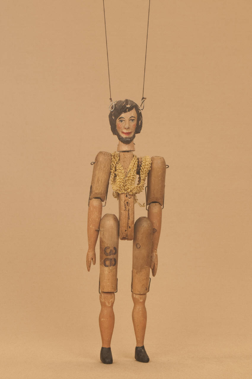 Testa in tiglio bloccata sul corpo in abete con arti in pioppo. Distanziatore in sughero per le braccia. Articolazioni realizzate con passanti in ferro.