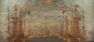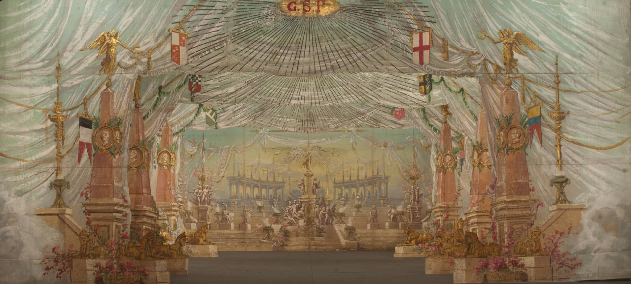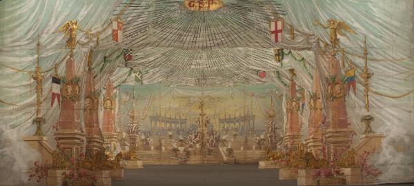 - NOTIZIE STORICO CRITICHE Scenografia realizzata per Il ballo "Excelsior", spettacolo che fu rappresentato la prima volta a Milano, al Teatro alla Scala, la sera dell'11 gennaio 1881. Autore del libretto e della coreografia era Luigi Manzotti, mentre Romualdo Marengo lo era della musica e Alfredo Edel delle scene e dei costumi.\nIl successo del ballo fu travolgente. Le repliche furono 103 nella stagione.\nLa versione marionettistica per la Compagnia Carlo Colla e Figli in due tempi e undici quadri fu allestita da Carlo II Colla col consenso dell'autore e presentata col titolo di "Civiltà e Progresso" nel 1895. Il titolo mutò poi nel tempo. Il primo allestimento del ballo ricordava ancora troppo l'originale scaligero. Ma fu sufficiente che lo spettacolo entrasse nella routine degli spostamenti della Compagnia perché le peculiarità del teatro marionettistico diventassero preponderanti.\nCosì l'"Excelsior" approdò al Teatro Gerolamo di Milano, quando la Compagnia ci entrò stabilmente nel 1906, proprio negli anni in cui, dopo qualche ultima apparizione, il "ballo grande" italiano, simbolico-narrativo sta tramontando sulle scene europee, divenendo unico retaggio del teatro delle marionette e, più particolarmente, della Compagnia Carlo Colla e Figli che ha continuato a riproporlo sino ad oggi, offrendo al pubblico di un secolo dopo la più vivida testimonianza del kolossal scaligero. Da nota scritta a matita sul "Giro Piazze della Compagnia Carlo Colla e Figli 1883-1912" si evince che la prima rappresentazione del ballo "Excelsior" è stata fatta a Caluso (TO) nel 1895.