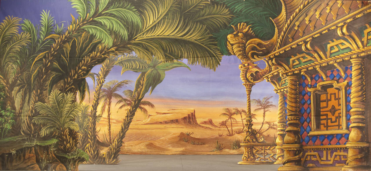 Scenografia in carta dipinta ad acqua e fortezzata ai bordi perimetrali , composta da un fondale due principali.