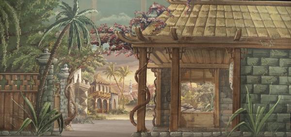 - NOTIZIE STORICO CRITICHE La scenografia è stata realizzata in due tempi.\nNel 1994 per il terzo principale ed il fondale sono stati utilizzati i pezzi della scena storica C01424 dello spettacolo "Il Drago Verde" raffigurante un "Villaggio". E, a completamento della scena, sono stati realizzati solo il primo ed il secondo principale.\nNel 2000, l'antica scena, è stata sostituita realizzando il terzo principale e il fondale che riprendono le fattezze e la composizione preesistente.\nIl fondale, il primo ed il secondo principale, se pur in epoche diverse, sono stati relizzati totalmente da F.Citterio.\nLa ""mano"" degli scenografi realizzatori si fonde,invece, in un unico segno amalgamandosi nell'impasto cromatico del terzo principale.\nLa scenografia è stata realizzata per la ripresa dello spettacolo "La Lampada di Aladino"" che nasce come riduzione teatrale per marionette nel 1994. L¿argomento è tratto dalla fiaba "Aladino e la lampada meravigliosa", appendice della raccolta "Le Mille e Una Notte". Lo spettacolo di Eugenio Monti Colla, andato in scena in prima mondiale al Festival di Spoleto con musiche di Danilo Lorenzini, snoda il racconto in tredici quadri di ambientazione cinese come indicato nella fiaba d¿origine e narra l¿evoluzione del protagonista da giovinetto a uomo maturo attraverso vicende di carattere fantastico e simbolico."