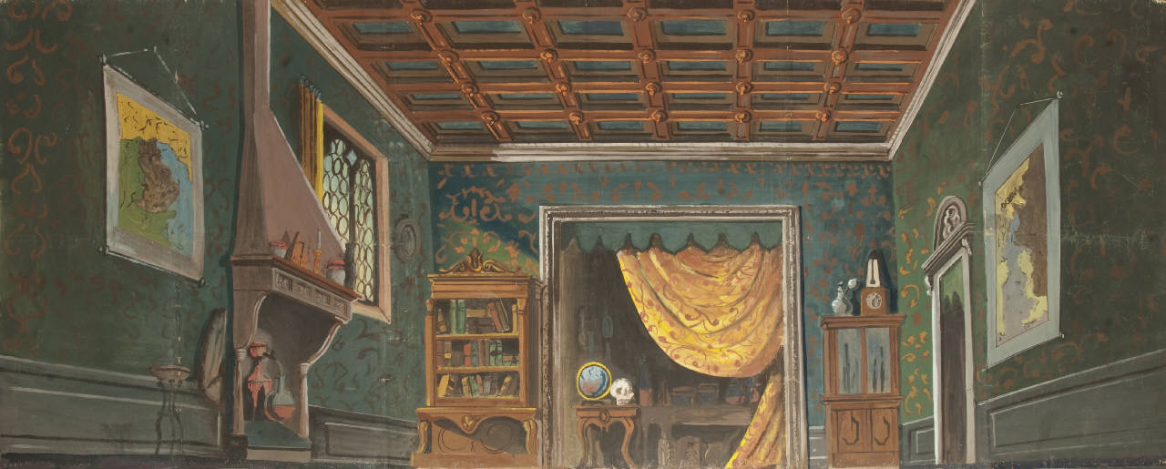 Scenografia in carta, fortezzata con strisce di tessuto di cotone, dipinta ad acqua e composta da un solo fondale.
