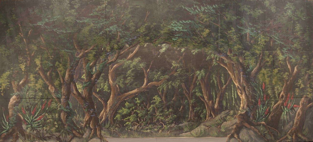 Scenografia in carta dipinta ad acqua e fortezzata ai bordi perimetrali, composta da un fondale e un principale.