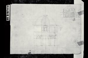 Prospetto e sezione di una chiesa con cupola. Prospetto e sezione di una chiesa con cupola